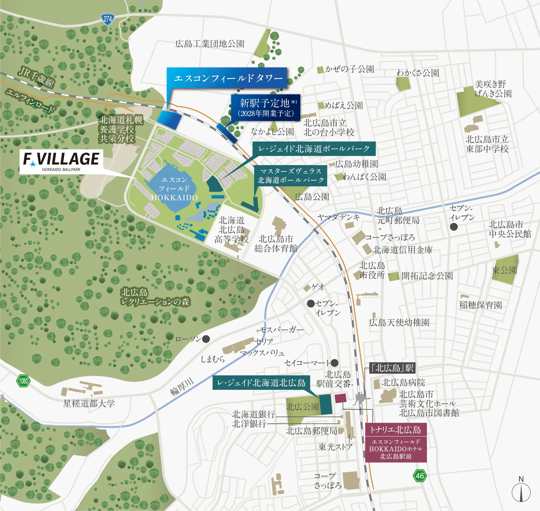 2026年1月現在、計画地アドレスは「北海道北広島市共栄」ですが、今後「北海道北広島市Fビレッジ」に町名を変更予定です。(出典:北広島市「ボールパーク地区町名・町界整備について」)