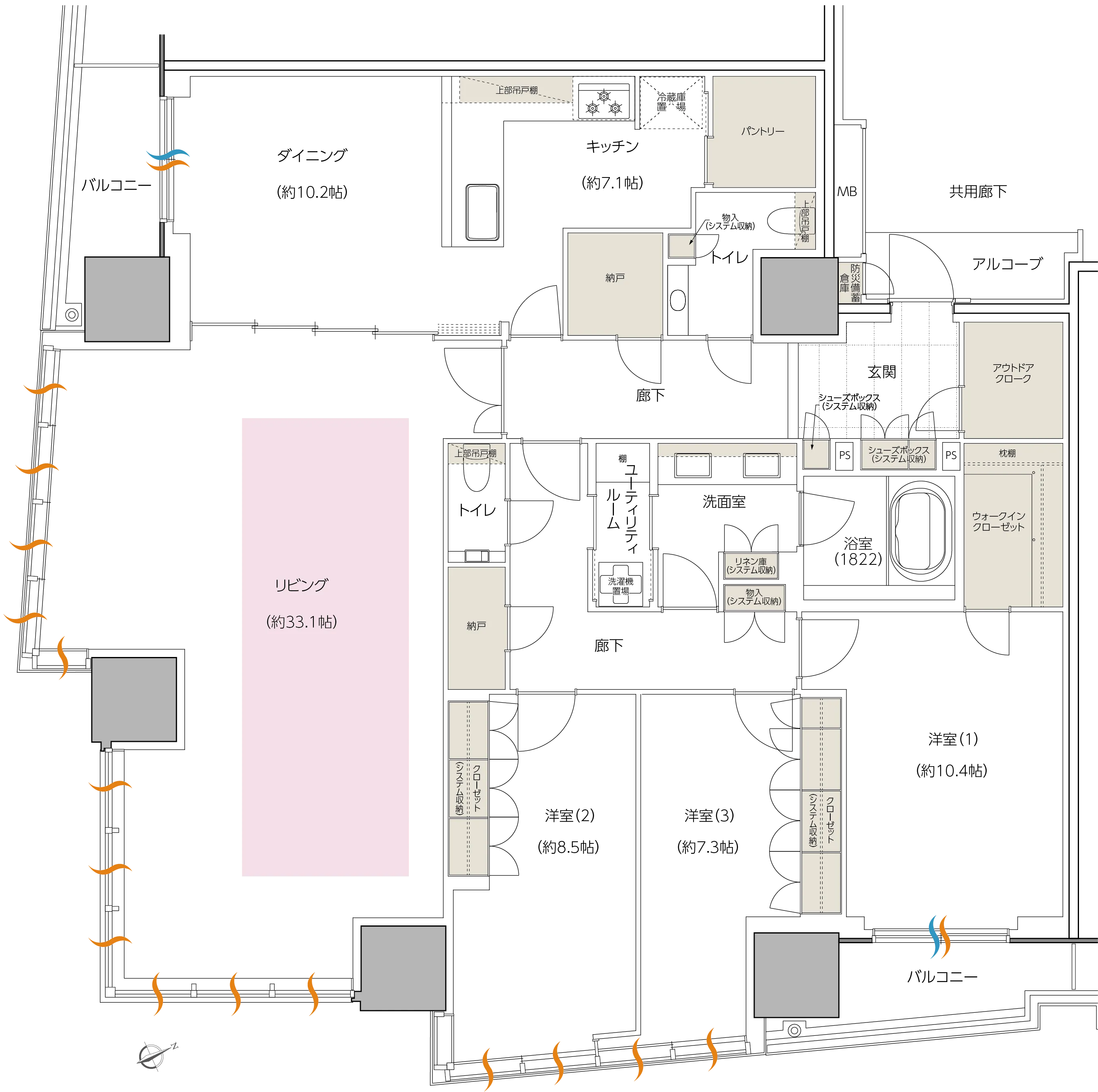 ゴルフバッグ、スキー用具、キャンプ用具などが収納できる「アウトドアクローク」を設置。