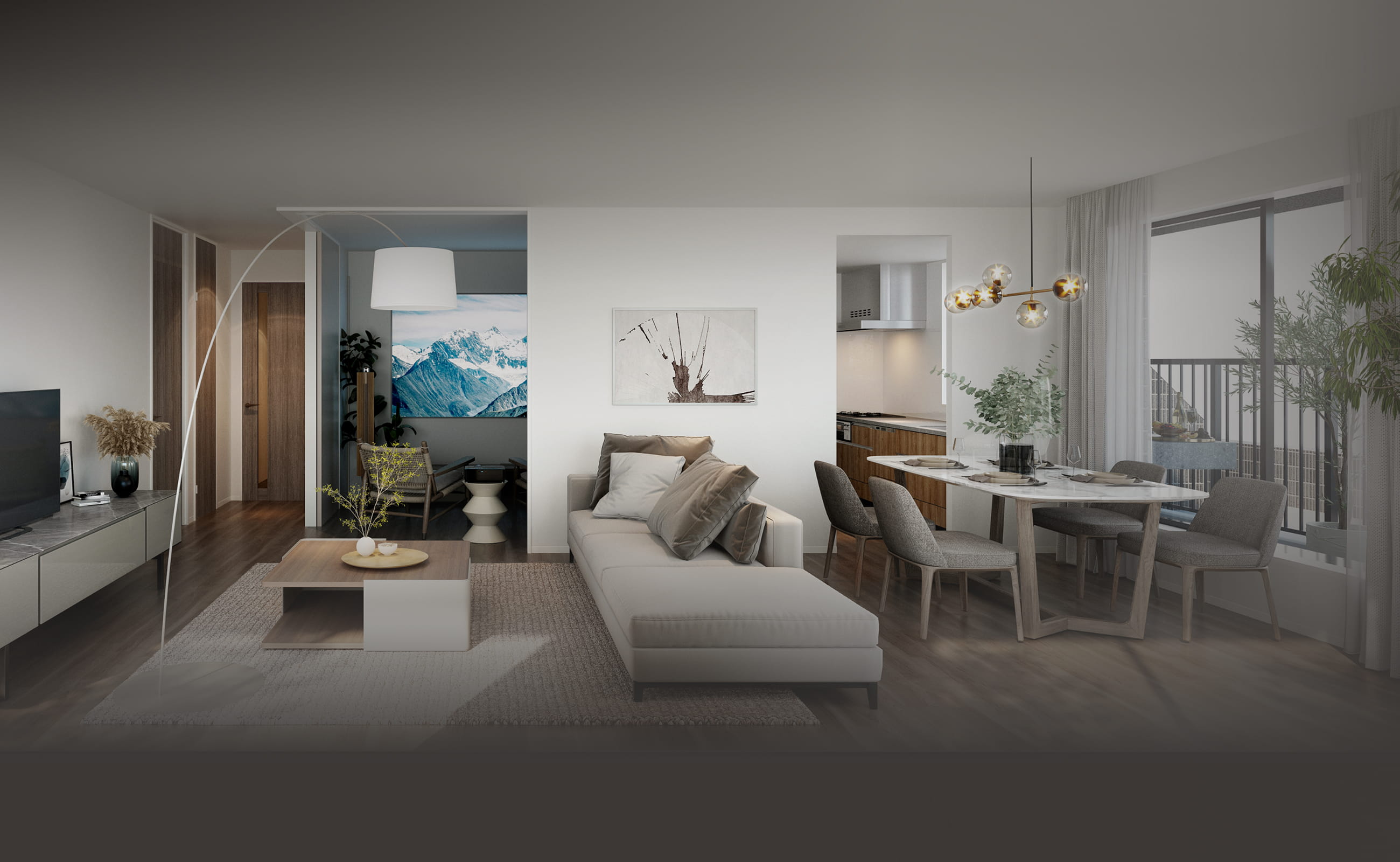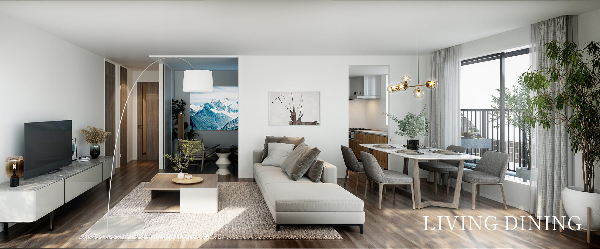 南向きを中心にプランニング。室内に柱の凹凸が無く家具を効率よく配することのできるアウトポール設計や、ウォークインクローゼットなどの豊富な収納、家事中にも会話が弾む対面式キッチンを採用。洗練された空間が憧れの暮らしを叶えます。