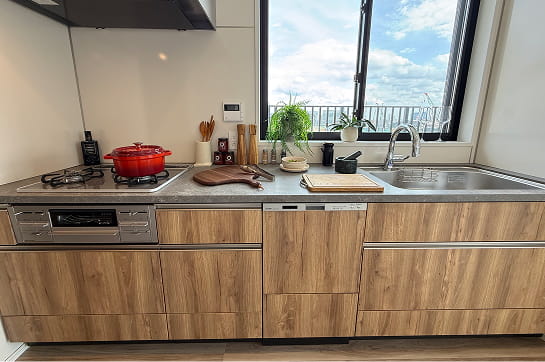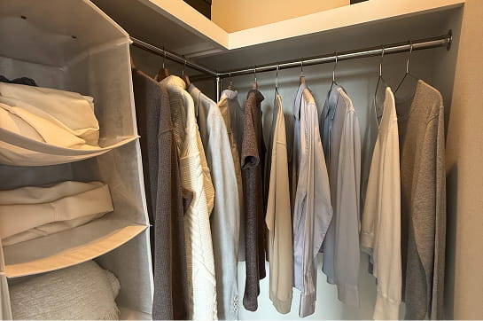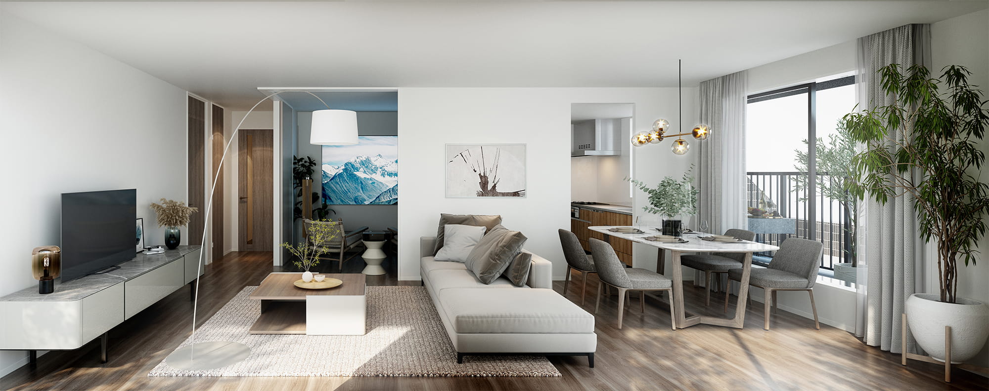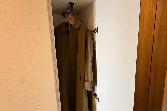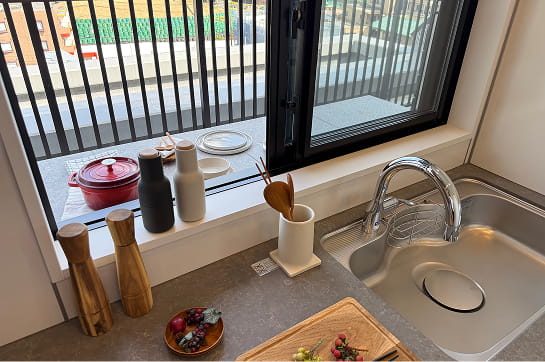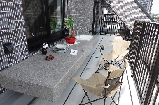共用廊下側・バルコニー側の柱を外部側に出した、アウトポール設計。居住空間から、柱型によるデッドスペースを取り除き、家具等も配置しやすい、スッキリとした室内空間を実現しました。