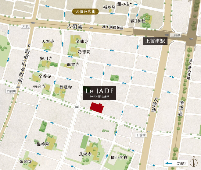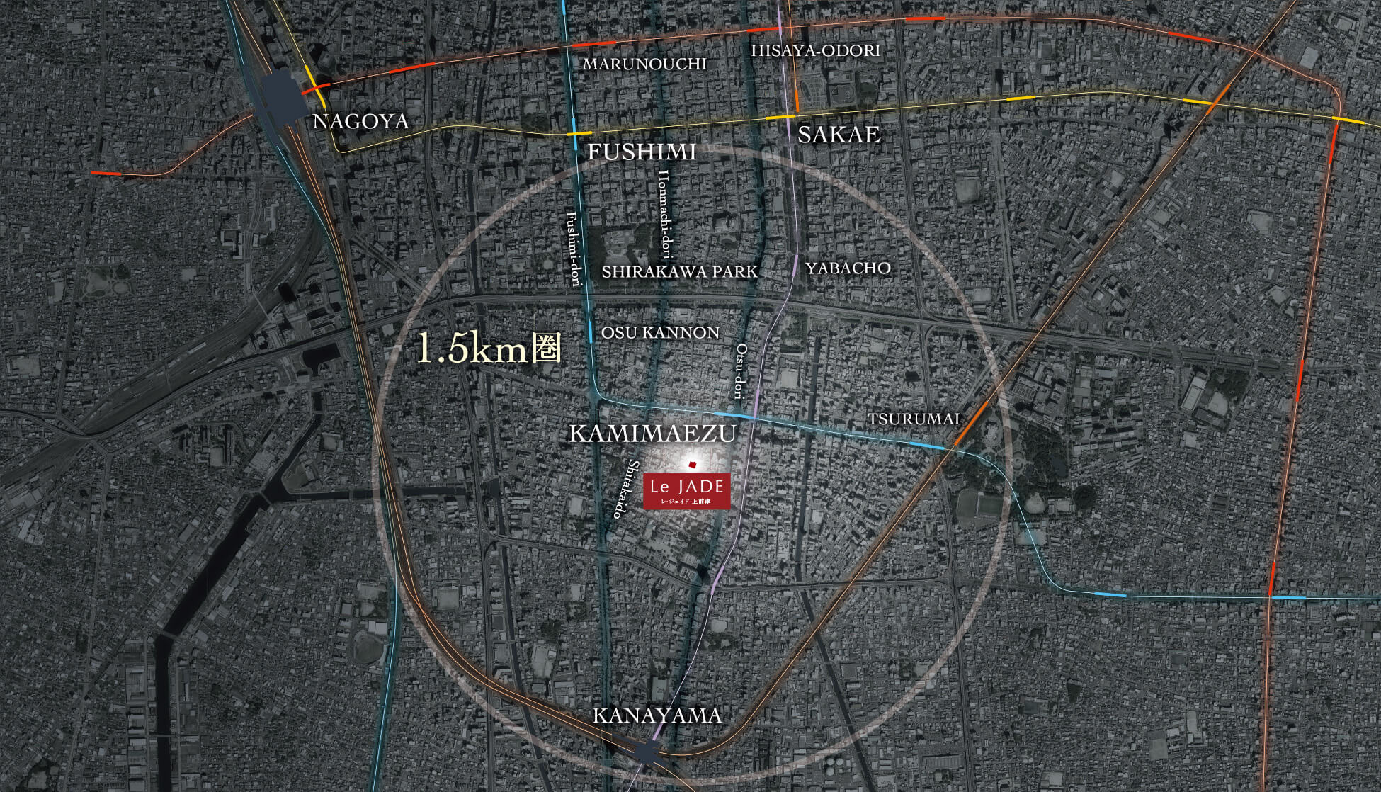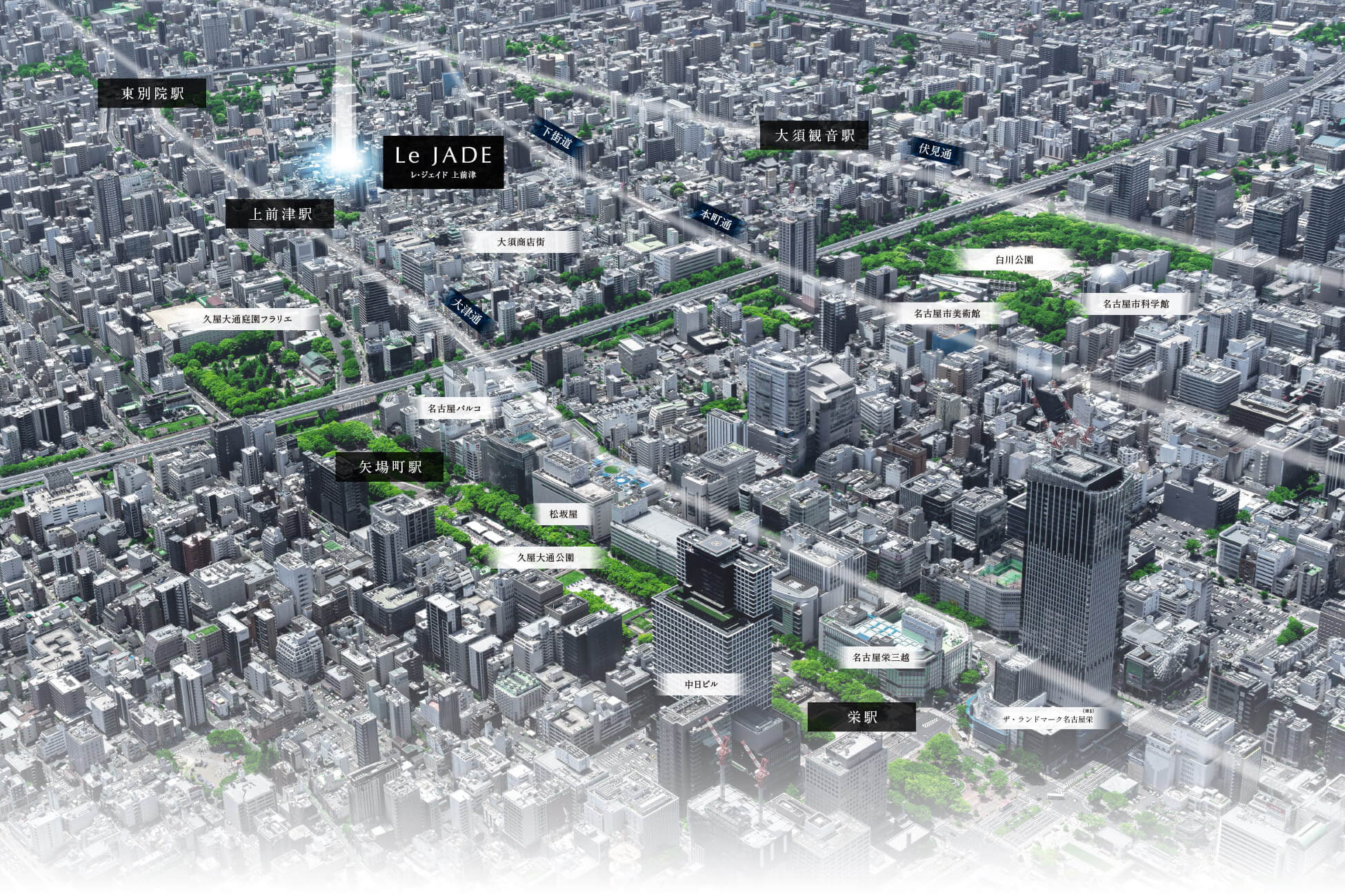 大須エリアの南側、大津通と旧:本町通である下街道に挟まれた上前津一丁目。地下鉄の乗り換え駅であり大須商店街の玄関口である「上前津」駅のアクセス性と利便性を享受しながらも歴史や文化の薫りが色濃く漂う静かな住環境が広がる街。「レ・ジェイド上前津」は、「上前津」駅 徒歩5分という駅近ながら全戸南向きを実現。さらに南側に幅員約15mの道路を擁するなど都心部では適うことが難しい条件を備えた地に誕生します。