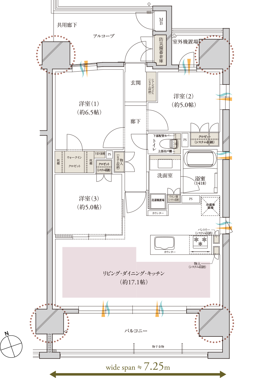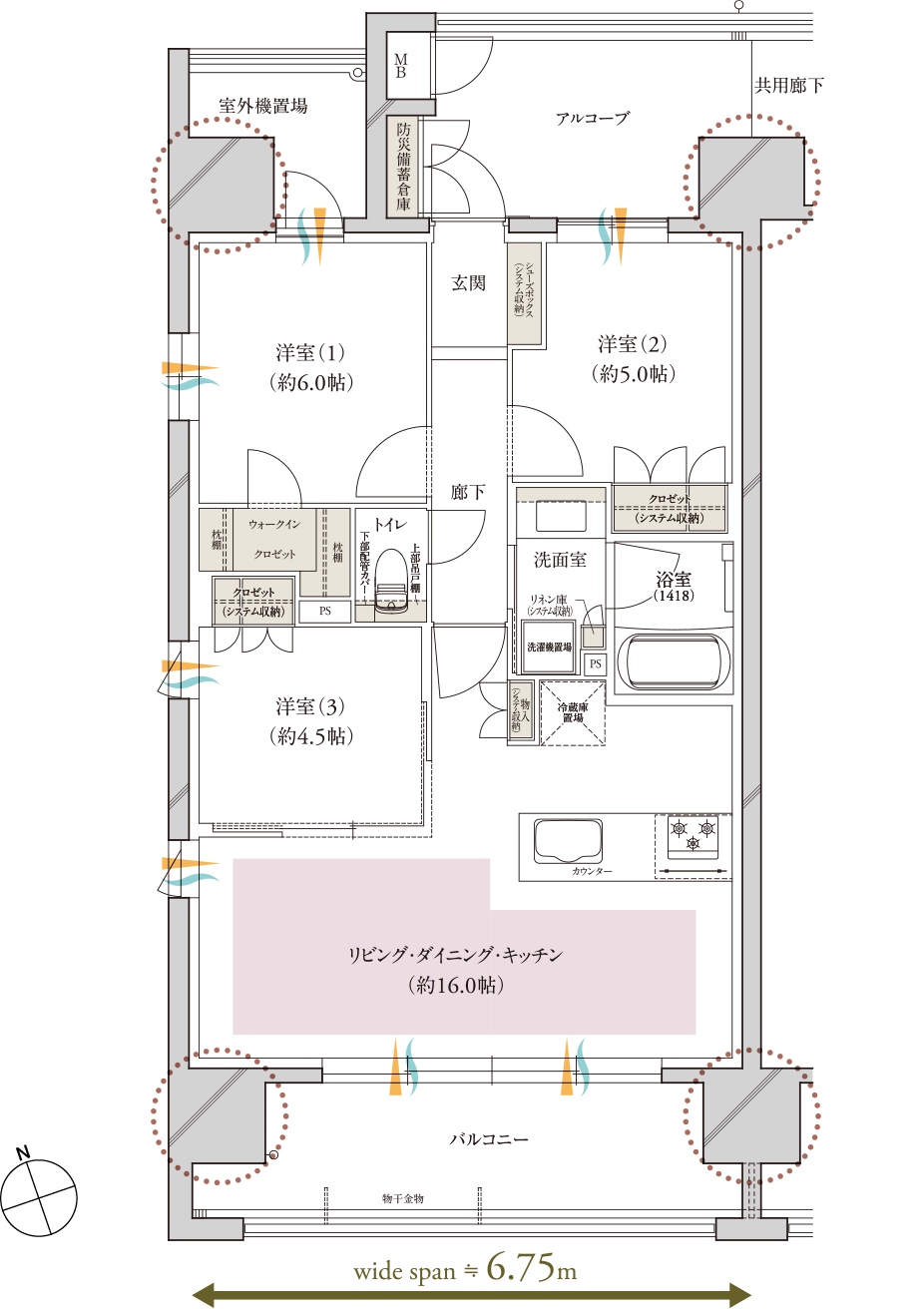 - □ 全居室に窓を設けた明るく通風にも恵まれる3面採光角住戸。