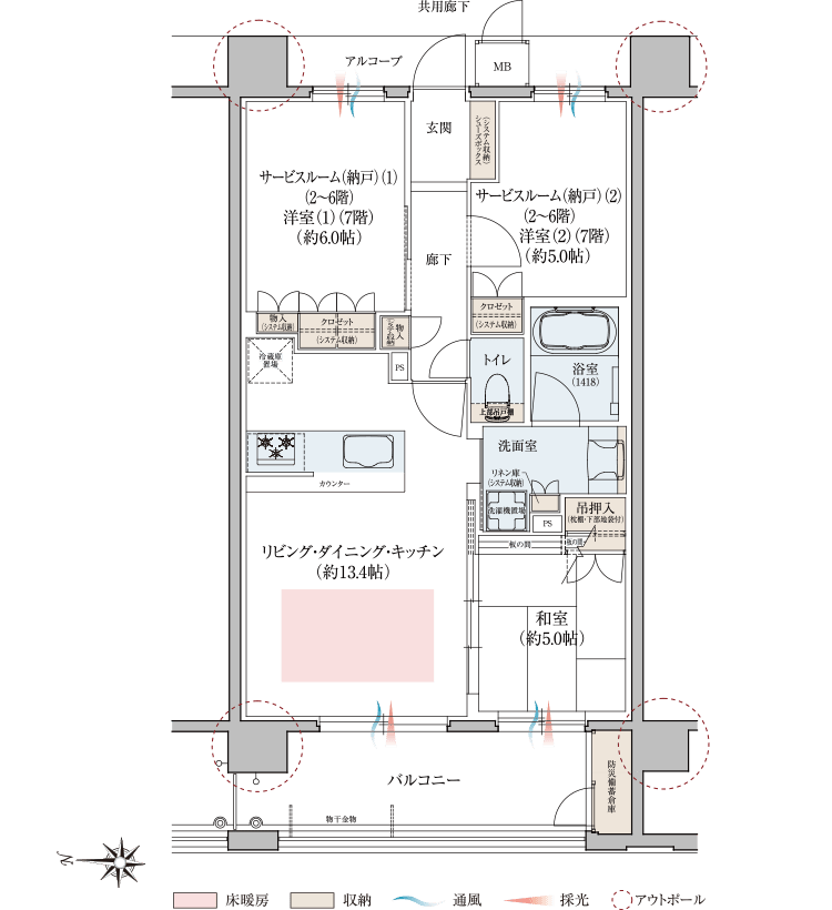 バルコニー面積/10.26㎡(約3.10坪) アルコーブ面積/4.48㎡(約1.35坪)※住居専有面積には防災備蓄倉庫1.26㎡(約0.38坪)を含みます。