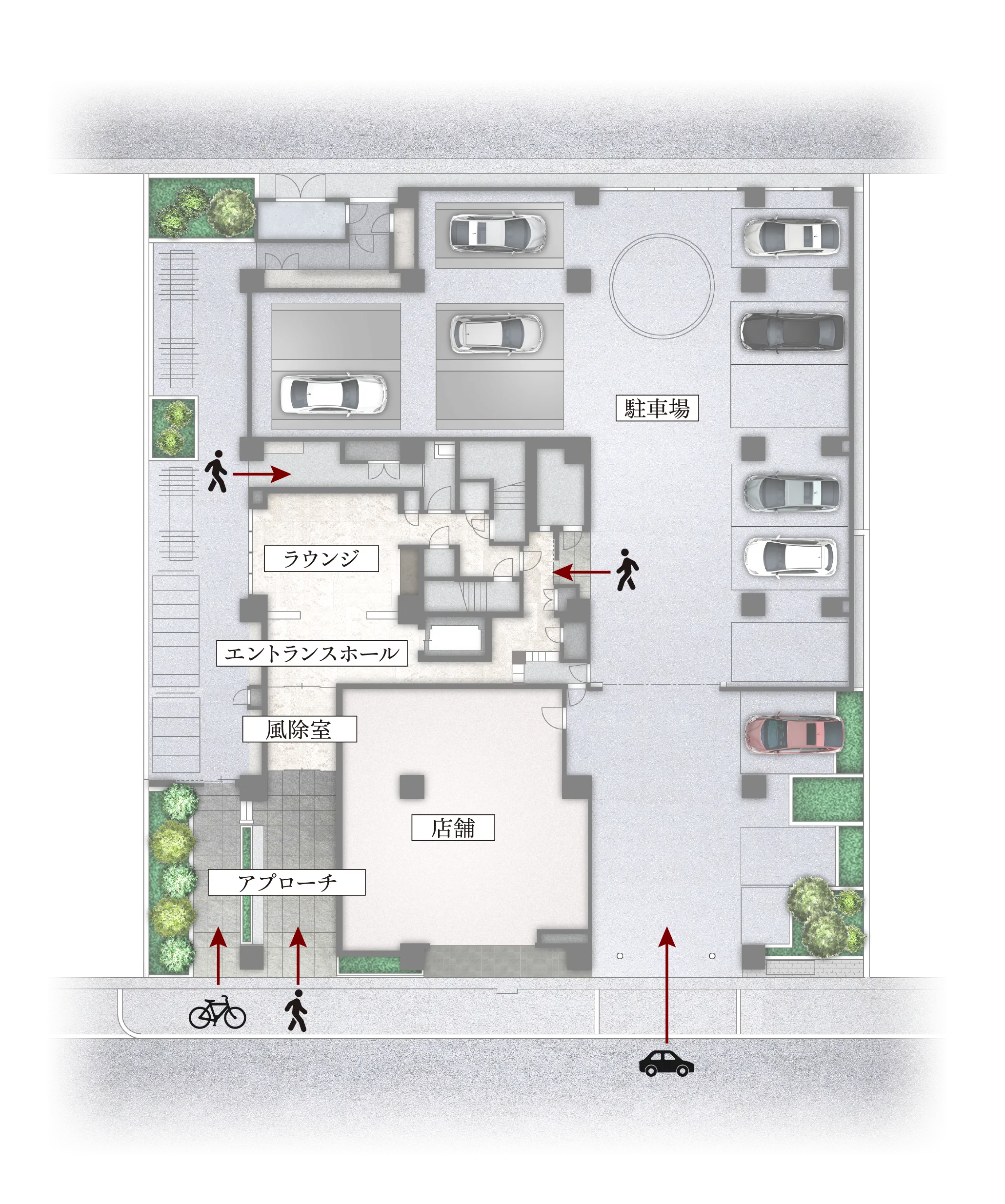 住まう人の安全と安心を第一に、歩行者と車、さらに自転車の動線を明確に分けた歩車分離設計を採用しています。