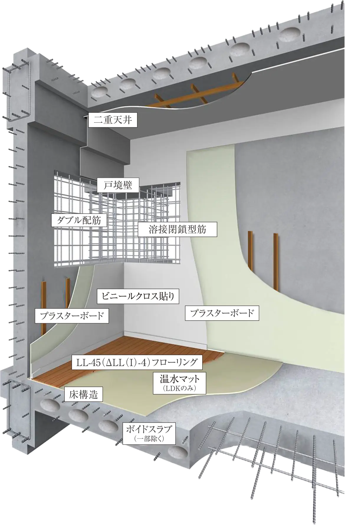床スラブ躯体として剛性を高めるため、ボイドスラブで厚さ約230mm以上(一部除く)を確保、その上で遮音性に配慮したLL-45(ΔLL(Ⅰ)-4)等級のフローリングを採用しています。(一部除く)