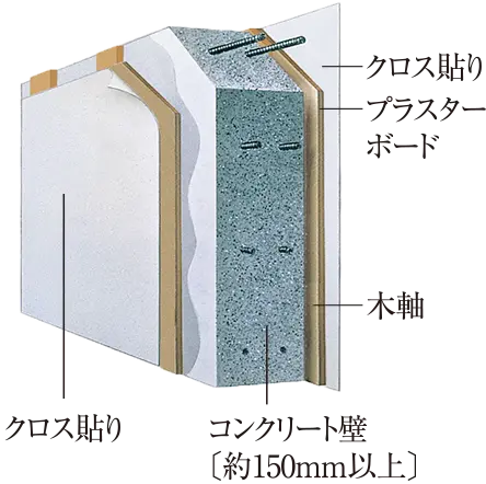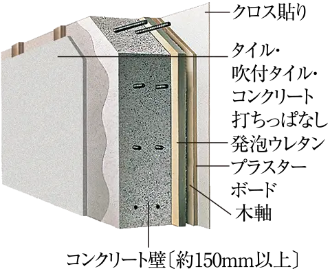 外壁コンクリート厚は約150mm以上、戸境壁はコンクリート壁を採用(一部乾式耐火遮音壁)。外壁は断熱性を高めた多重構造で、省エネ性に優れ、結露も防ぎます。