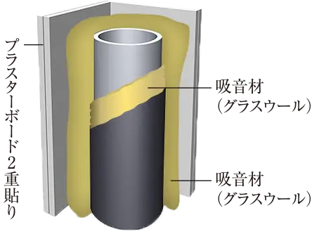 居室に面するパイプスペースの壁はプラスターボードを二重貼り+グラスウール。さらに排水管にも吸音材+遮音シートを巻き、防音対策を実施しています。(一部除く)