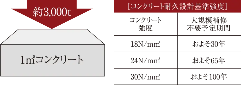 一般的なコンクリートよりも強度の高い設計基準強度Fc=30〜36N/㎟。1㎡当たり約3,000トンの重量を支えられることを示しています。