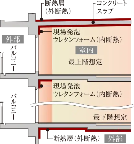 外部に面する壁・梁・柱の内側には、現場発泡ウレタンフォームによる内断熱工法を採用しています。また、外気の影響を受けやすい最上階や最下階住戸には、コンクリートスラブの上(最下層はスラブの下)に断熱層を設ける外断熱工法(一部除く)を採用し、外気や直射日光などによる室内温度の変化を緩和します。