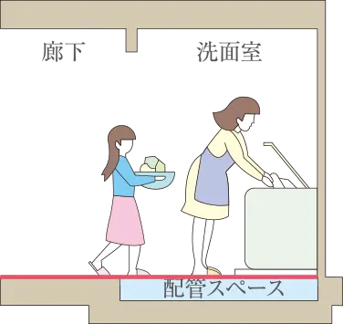 つまずき事故となりやすい住戸内の段差をなくした(玄関框を除く)フルフラット設計で、洗面室と浴室の間などの段差も解消。床段差のない住まいは安全だけでなく、掃除機の移動等もスムーズになり家事効率も高めてくれます。