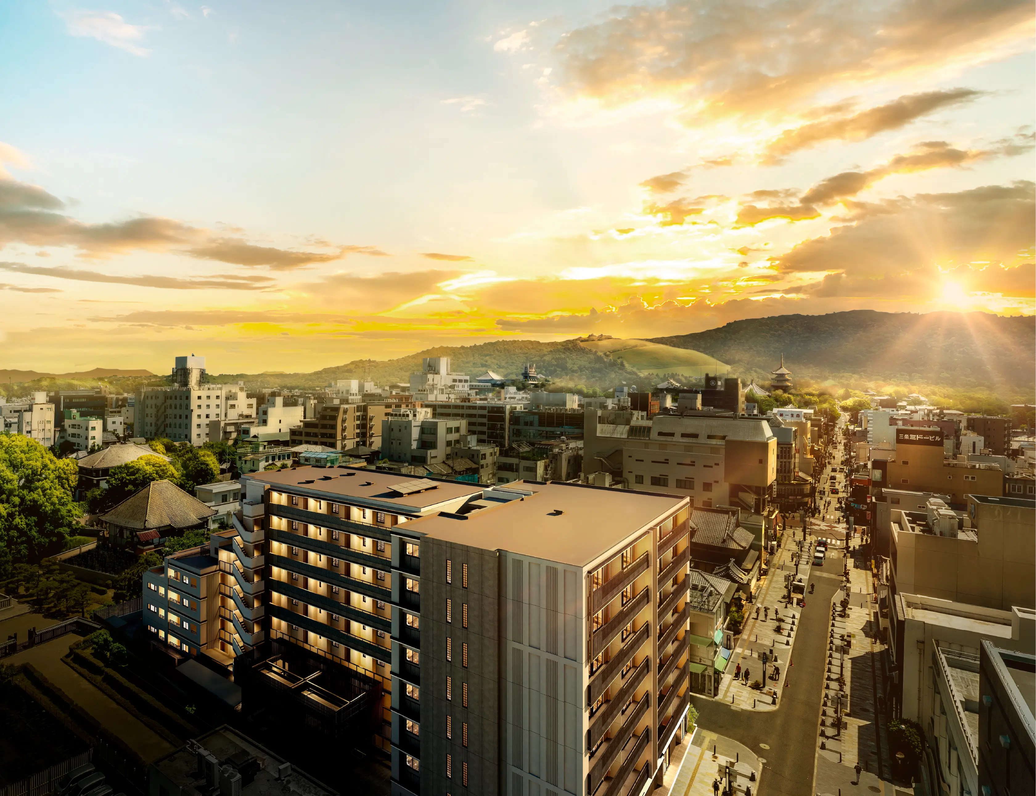 ゆっくり雲が流れる広い空や、歴史の趣と現代の建物が織りなす古都の街並みなど、スケールの大きな東向きの眺望を満喫。