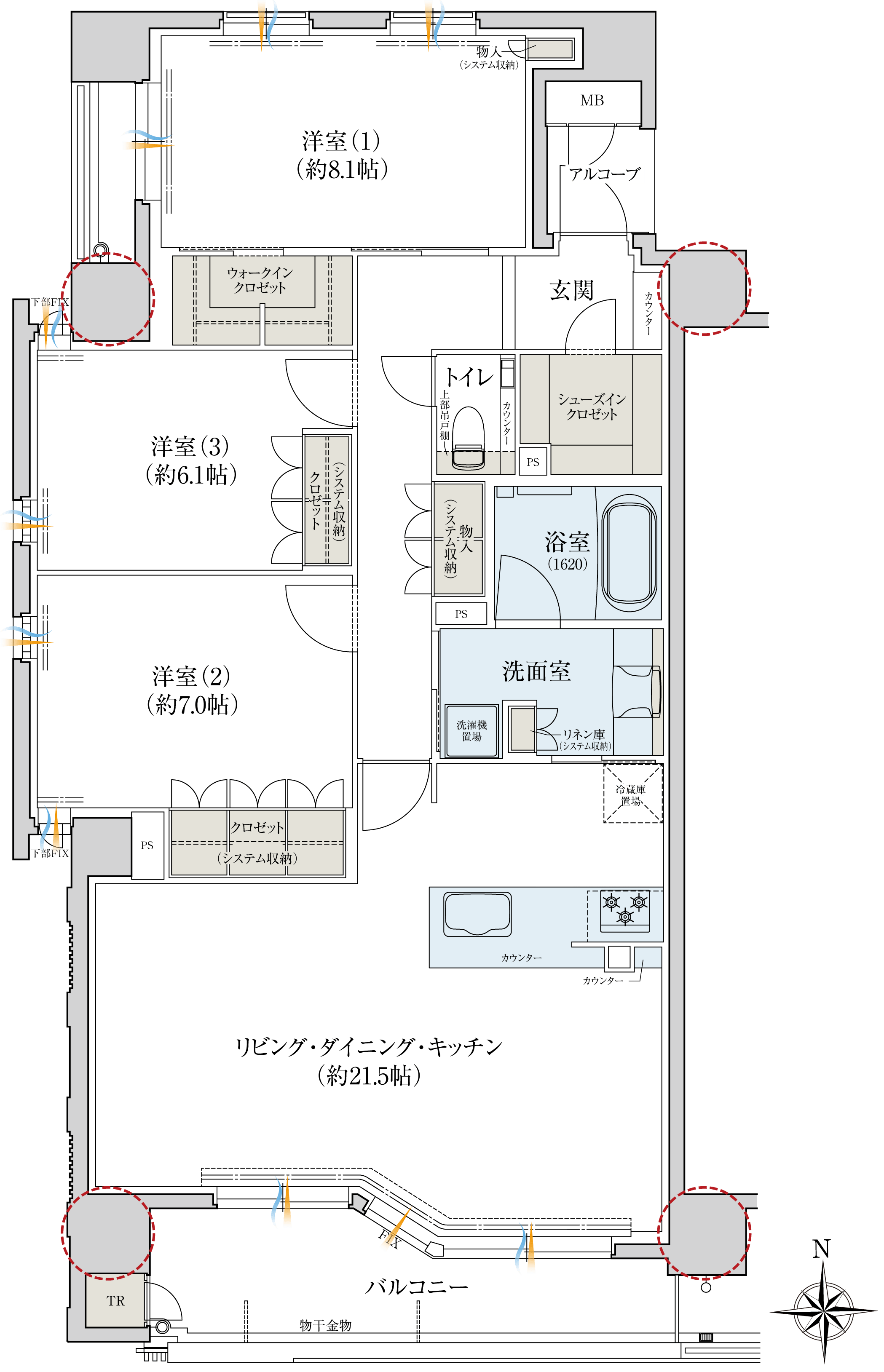 クロゼット、物入と豊富な収納スペース。 - □洋室(1)は、風通しの良い2面開口。