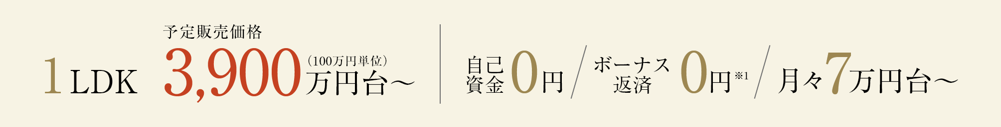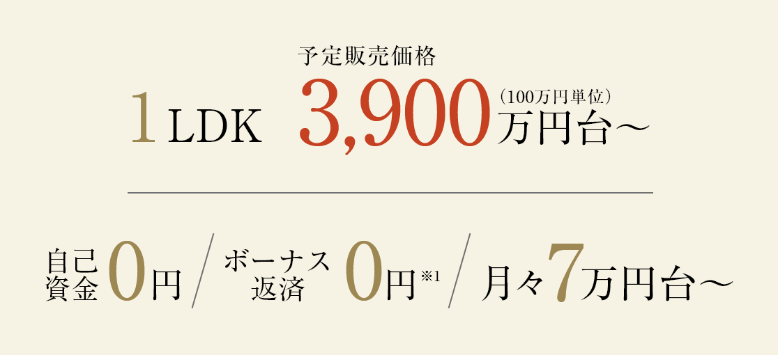 • ※1 返済例/タイプ:Cタイプ 専有面積 41.39㎡ 1LDK、3990万円、自己資金 0円、借入期間 50年、借入額 3990万円の場合(月々の元本3990万円、ボーナス払いの元本0円)月々78,815円(年12回)、ボーナス時加算 0円(年2回) ※金利は2025年10月時点