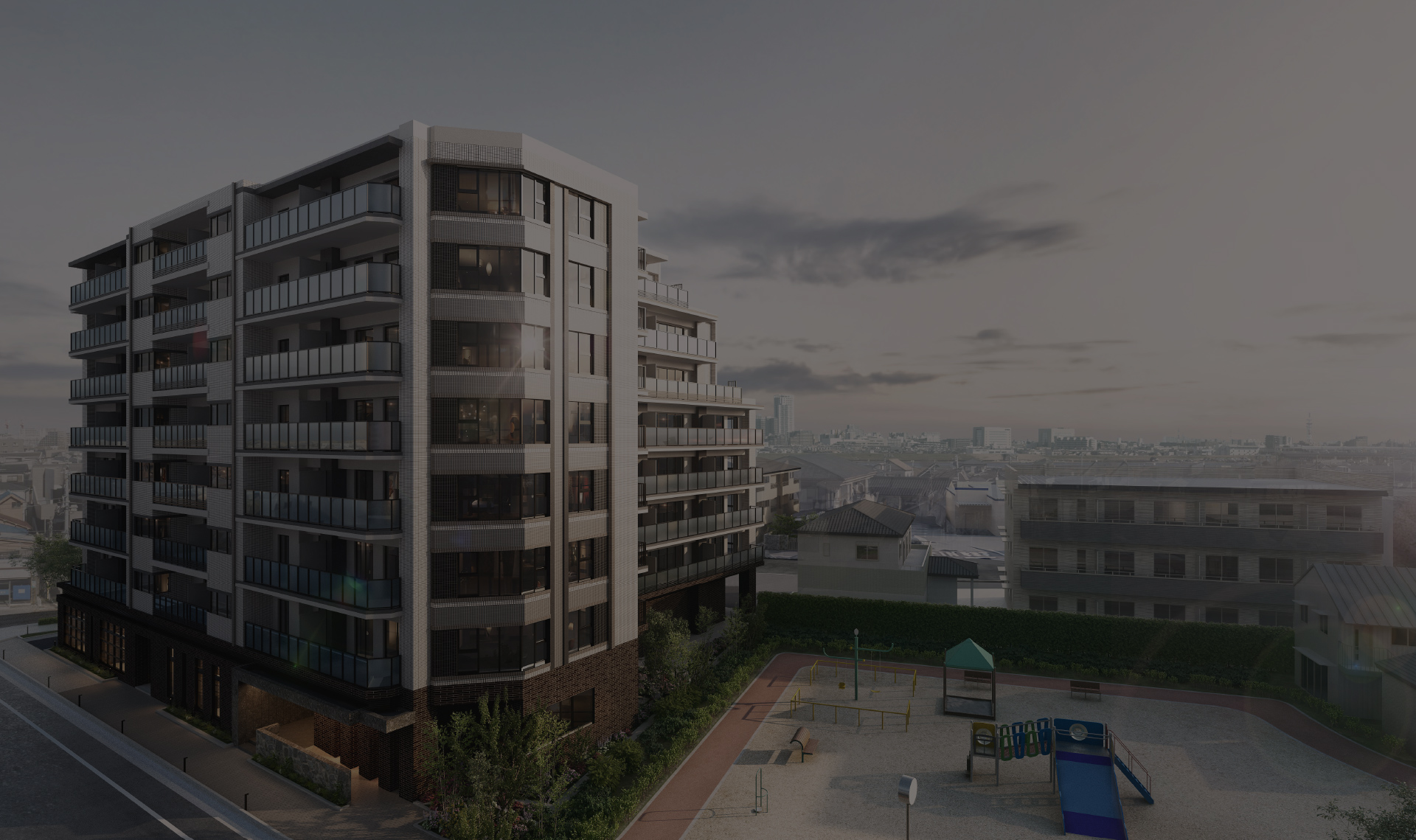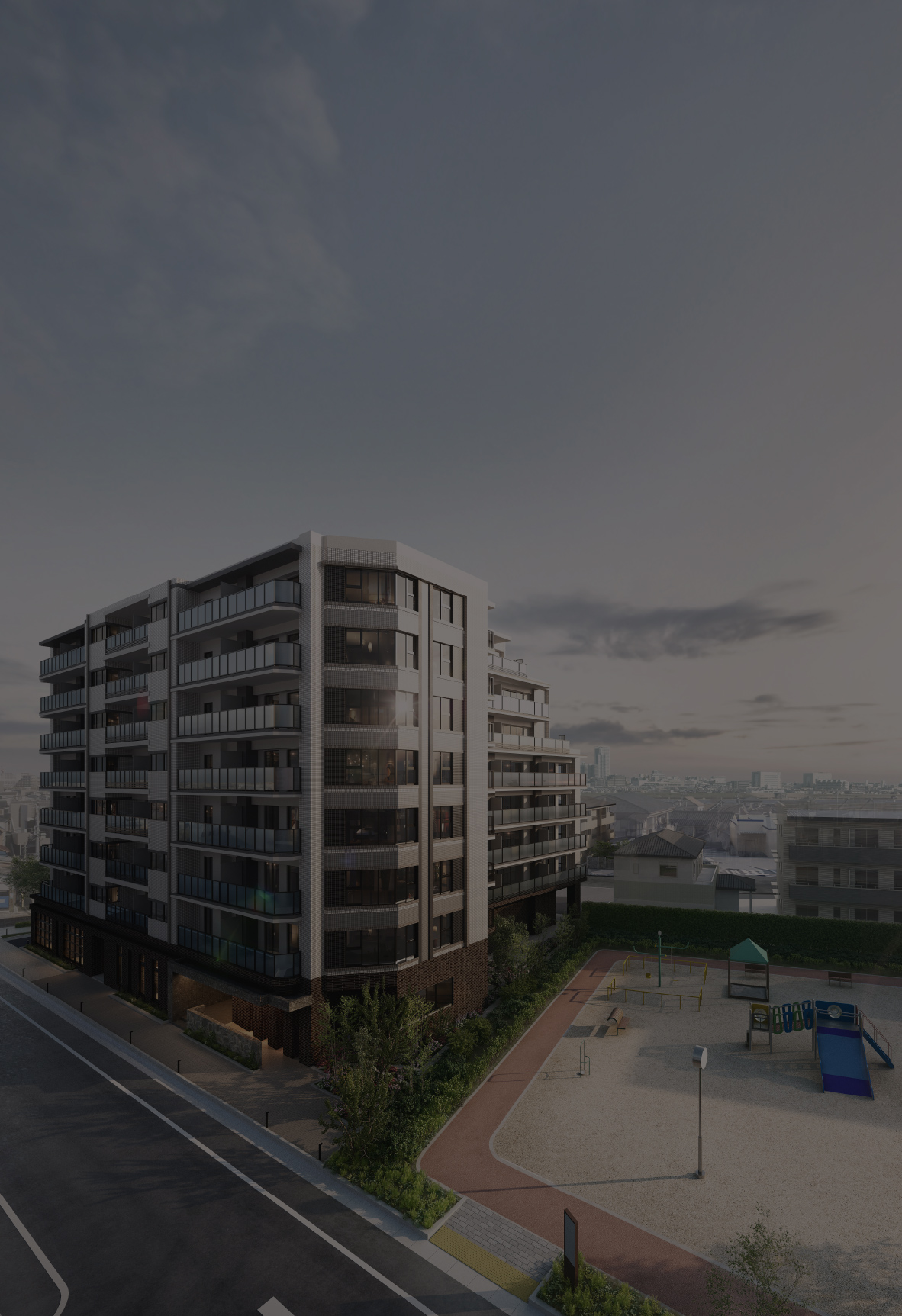 ※掲載の外観完成予想CGは、図面を基に描き起こしたCGに、現地5階相当の高さから撮影(2025年1月)した周辺眺望写真を合成加工を施したものです。建物の形状、仕様、色調、外構、植栽等は行政官庁の指導、施工上の都合及び改良のため、一部変更が生ずる場合があります。敷地周辺の建物・電柱・標識・架線・ガードレール・植栽等は、一部簡略化および省略しております。植栽につきましては特定の季節の状況を表現したものではなく、竣工時には完成予想図程度には成長しておりません。また、季節ごとに咲く花々を同時に描いております。あらかじめ、ご了承ください。