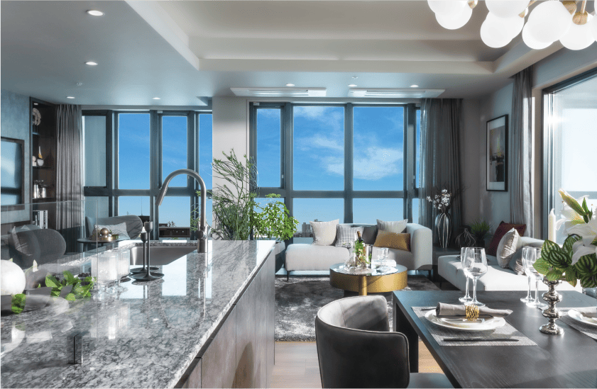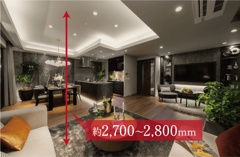 上質を愉しむ、開放のリビングダイニング。約2,700〜2,800mmのゆとりある天井高が生み出す、格別の広がり。誇りと安らぎに満ちた、贅沢な時間がここにあります。