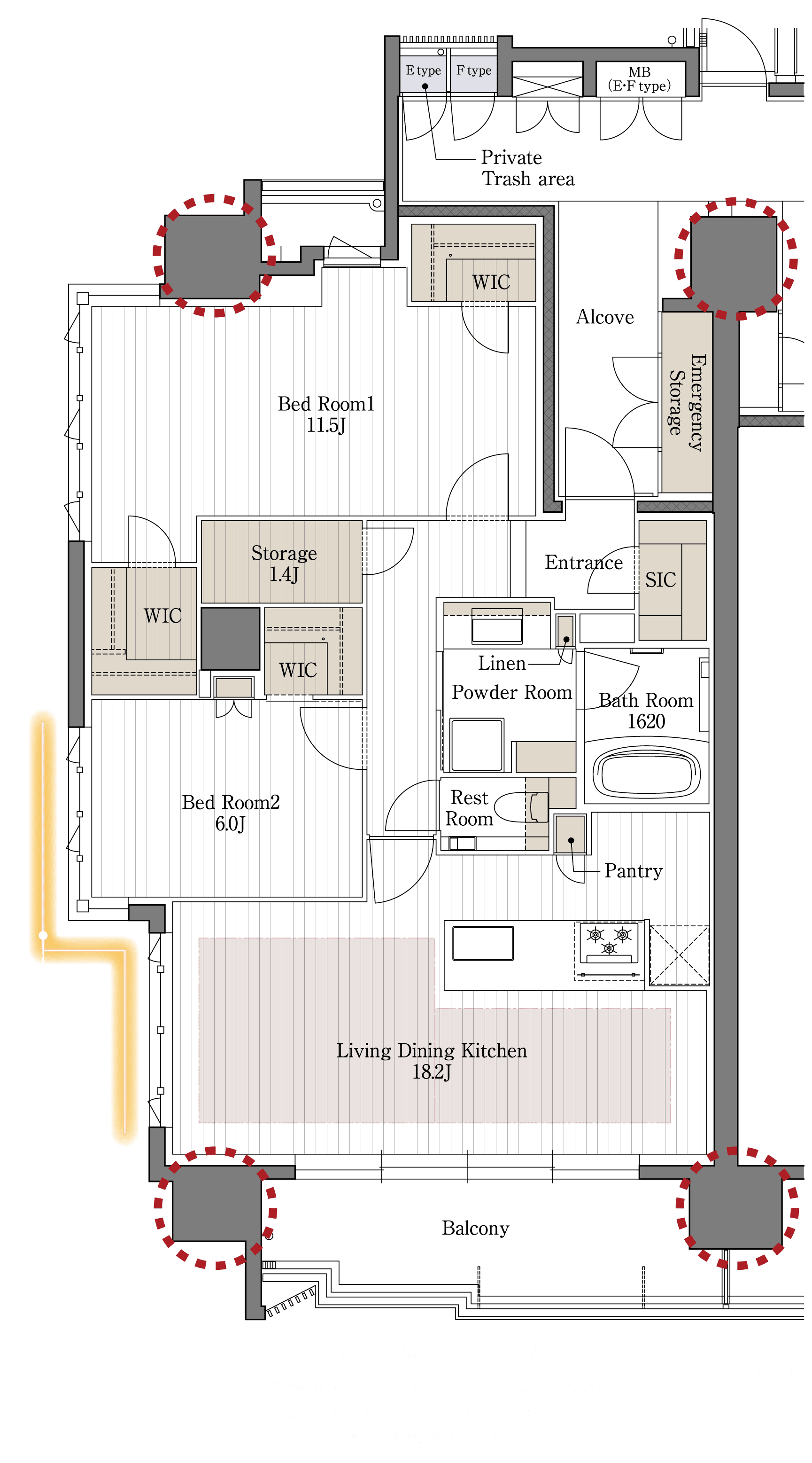 ※掲載の間取り図面は開発段階のもので、設計・施工上の都合により変更する場合があります。※方位記号は若干誤差があります。正確な方位については設計図書でご確認ください。※E、Fタイプのみとなります。