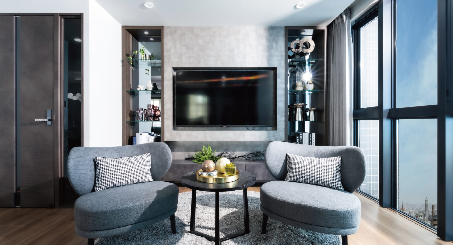 高級感漂うマテリアルが創り出す、ホテルライクな内廊下。1フロア2邸だけの、静穏でプライベートな動線を実現しました。
