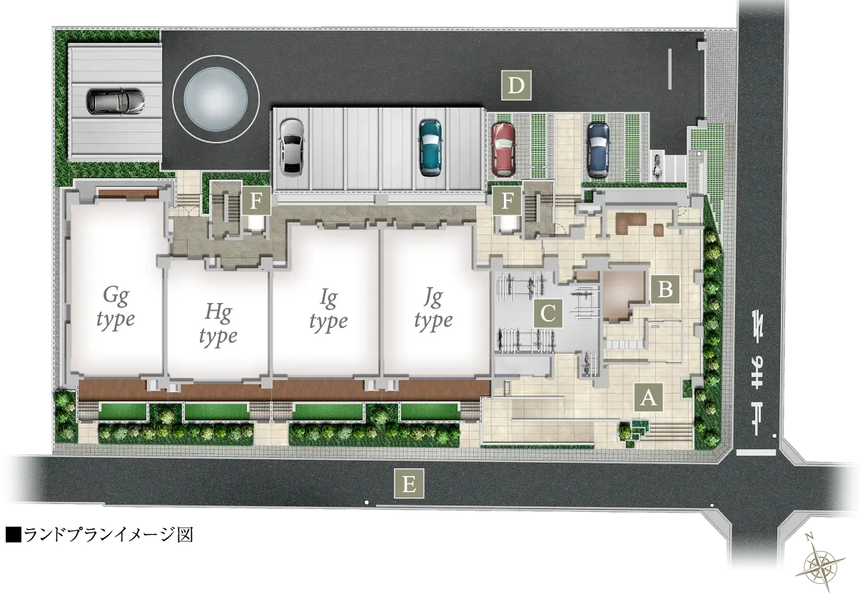 - 角立地の敷地に南向きで住棟を配置。道路に面して植栽帯を設け、プライバシー性を高めています。