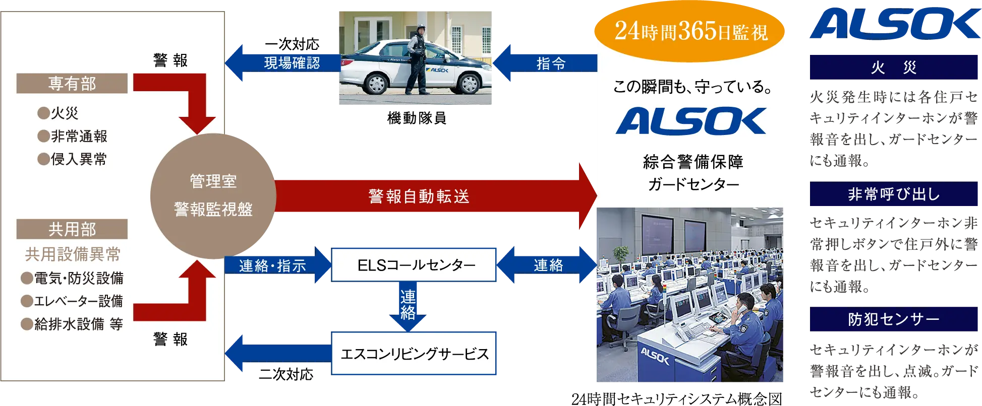 - 共用部で発生した警報等を24時間・365日フルタイムで監視する機械警備セキュリティシステムを導入。警備会社は信頼の綜合警備保障。各センサーが異常をキャッチすると速やかに対応。緊急時には、警察や消防などの関連機関に通報し出動を要請するなど、万一のための体制を確立しています。