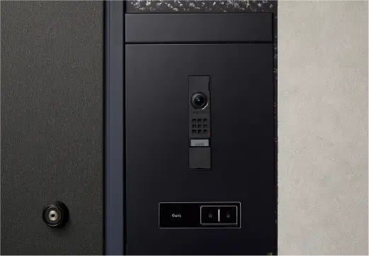 風除室の集合インターホンで住戸の番号を押すと、住戸内の呼び出し音が鳴り、モニターにカラー映像が映って自動的に録画。タッチパネル式で簡単に操作ができます。外出先でもスマートフォン・タブレット端末などで、集合玄関横・玄関子機からの呼出時の対応が可能となります。