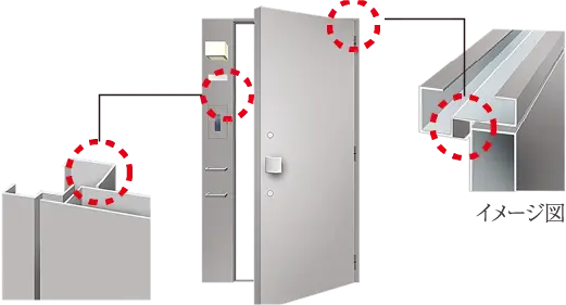 - 耐震ドア枠は戸先部分、ドア上部にクリアランスを設けることで変形に対応。地震の揺れでドア枠が変形し開放できないリスクを軽減します。