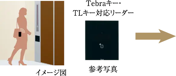 - Tebraキーをポケットやカバンから取り出すことなくセンサーに近づくだけで風除室のオートロックを解除。荷物が多い時にも楽にお入りいただけます。